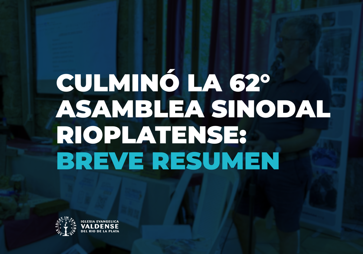 Mudanza y reorganización: la biblioteca avanza hacia su inauguraciónMudanza y reorganización: la biblioteca avanza hacia su inauguración4 marzo, 2026NoticiasMinisterios particulares: un llamado a profundizar la reflexiónMinisterios particulares: un llamado a profundizar la reflexión25 febrero, 2026NoticiasLa Iglesia Evangélica de lengua italiana de Zúrich – Waldenser busca un pastor o pastoraLa Iglesia Evangélica de lengua italiana de Zúrich – Waldenser busca un pastor o pastora23 febrero, 2026NoticiasMesa Valdense: prioridades y desafíos tras el Sínodo 2026Mesa Valdense: prioridades y desafíos tras el Sínodo 202620 febrero, 2026NoticiasCulminó la 62° Asamblea Sinodal Rioplatense: breve resumen Culminó la 62° Asamblea Sinodal Rioplatense: breve resumen 1 febrero, 2026Noticias, SínodosConversar para convivir: hacia una cultura de la pazConversar para convivir: hacia una cultura de la paz1 febrero, 2026Noticias, Sínodos ENLACES DE INTERÉS Espacio Cultural Página Valdense Liturgia Estudios Bíblicos Reflexiones - Pan de Vida Educación Cristiana PRÓXIMOS EVENTOS Mar 21 10:00 am - 5:00 pm Asamblea Presbiterio Colonia Sur Mar 28 10:00 am - 6:00 pm Asamblea del Presbiterio Colonia Norte y Soriano Ver calendario Ver todos los eventos