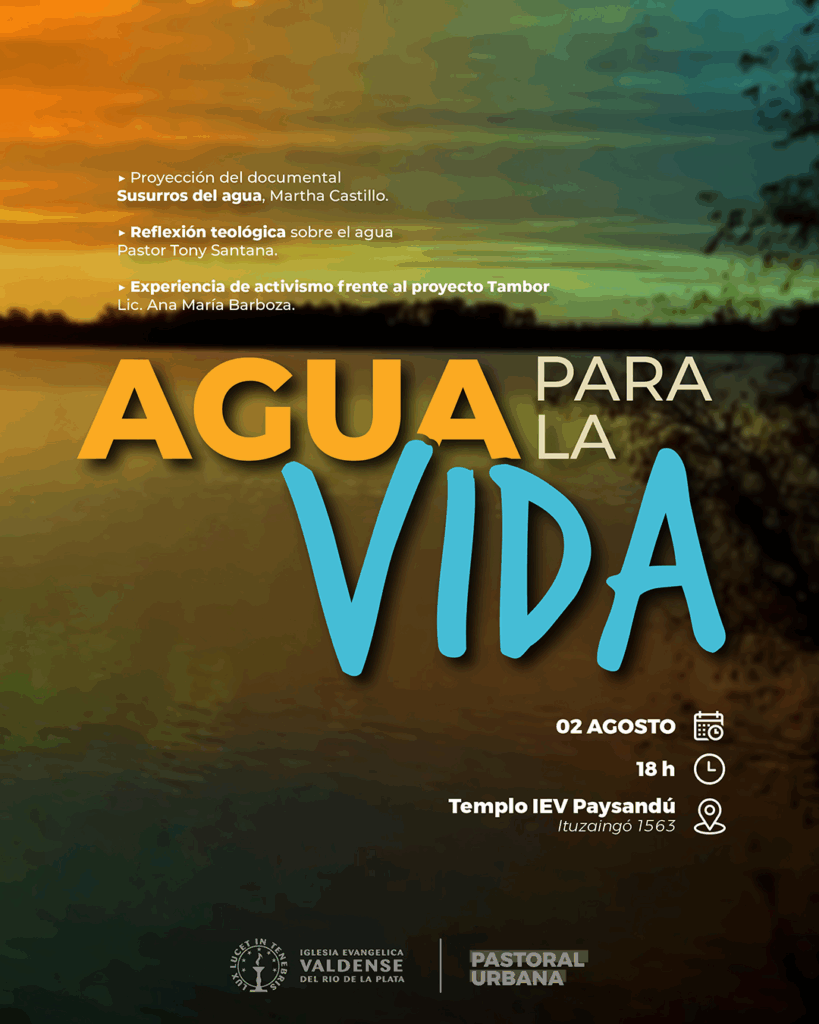 Tendremos la proyección del documental «Susurros del agua» de Martha Castillo, un momento de reflexión teológica sobre el agua a cargo del pastor Tony Santana y la invitación a Ana María Barboza, Licenciada en desarrollo, activista del movimiento indígena e integrante del grupo Eco Tambores, Docente e investigadora en UDELAR sede Tacuarembó, a presentar su experiencia de activismo frente al proyecto Tambor de planta de e-metanol.